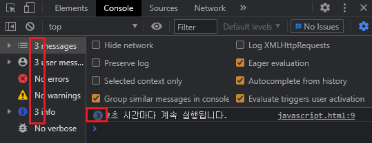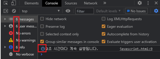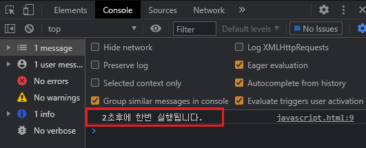 console . log ( "2초 시간마다 계속 실행됩니다." );