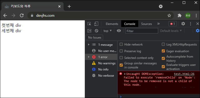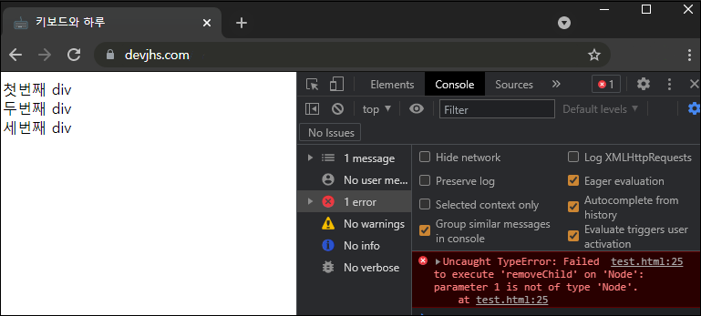 그런데 여기서는 child_div4를 제거하겠다고 하니깐 위와 같은 에러가 발생하는 것을 확인하실 수 있습니다.