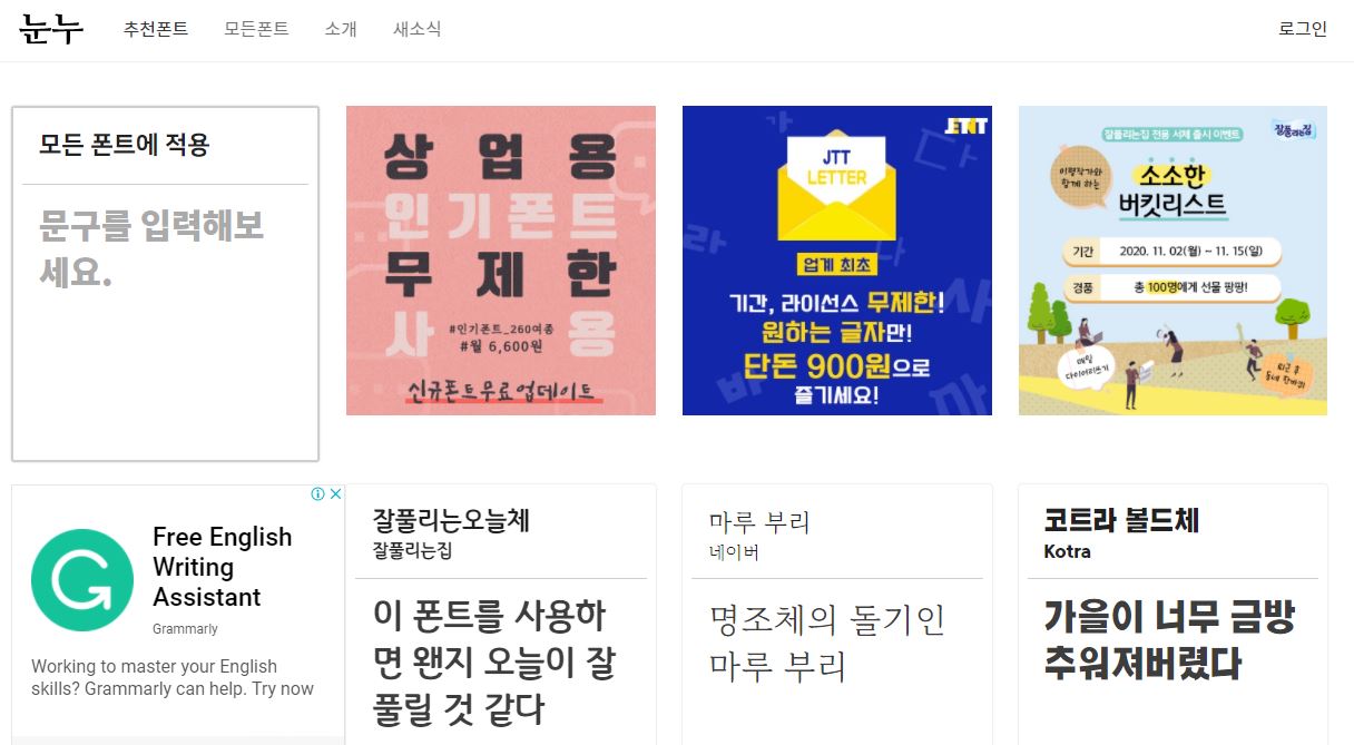 눈누 사이트에 들어가서 추천 폰트, 모든 폰트를 눌러보면 위에 그림처럼 사용가능한 폰트가 나오게 됩니다.
