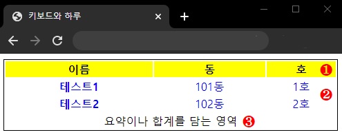 <tfoot> : 표의 구조를 나눌 때 마지막에 표시되는 내용으로 요약이나 합계에 해당하는 부분됨