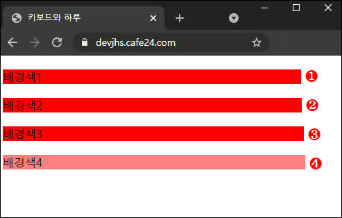네번째 예제는 rgba 표기법인데 3번에서 보는 것과 같이 사용하되 맨 마지막에 투명도를 나타내는 값을 넣을 수가 있습니다.