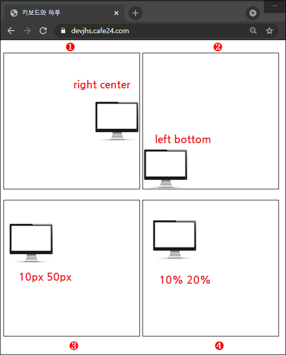 background-position는 수평 위치 값과 수직 위치 값을 표시해 이미지의 위치를 지정할 수 있음