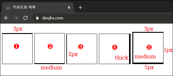 border-top-width, border-right-width, border-left-width,border-bottom-width 등과 같이 각각으로 두께를 지정할 수 있음
