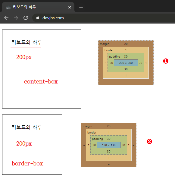 그래서 콘텐츠 영역만 너비와 높이로 지정할 것인지 패딩이나 테두리 크기 등 까지도 합쳐서 너비와 높이로 나타낼지에 대한 속성을 지정할 수 있음