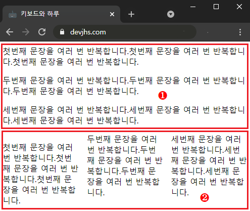 | 1 2 3 4 5 6 7 8 9 10 11 12 13 14 15 16 17 18 19 20 21 22 23 24 25 26 27 28 | < !DOCTYPE html> < html lang= "kr" > < head> < meta charset= "utf-8" > < title> 키보드와 하루 < /title> < /head> < body> 1 < div> <p> 첫번째 문장을 여러 번 반복합니다.첫번째 문장을 여러 번 반복합니다.첫번째 문장을 여러 번 반복합니다. </p> <p> 두번째 문장을 여러 번 반복합니다.두번째 문장을 여러 번 반복합니다.두번째 문장을 여러 번 반복합니다. </p> <p> 세번째 문장을 여러 번 반복합니다.세번째 문장을 여러 번 반복합니다.세번째 문장을 여러 번 반복합니다. </p> < /div> 2 < divstyle =' column-width : 100px ' > <p> 첫번째 문장을 여러 번 반복합니다.첫번째 문장을 여러 번 반복합니다.첫번째 문장을 여러 번 반복합니다. </p> <p> 두번째 문장을 여러 번 반복합니다.두번째 문장을 여러 번 반복합니다.두번째 문장을 여러 번 반복합니다. </p> <p> 세번째 문장을 여러 번 반복합니다.세번째 문장을 여러 번 반복합니다.세번째 문장을 여러 번 반복합니다. </p> < /div> < /body> < /html> |