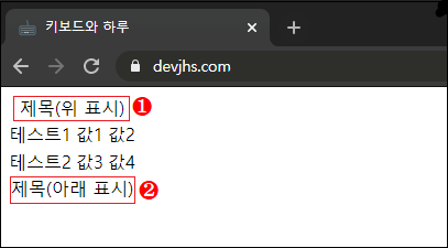 | 1 2 3 4 5 6 7 8 9 10 11 12 13 14 15 16 17 18 19 20 21 22 23 24 25 26 | < !DOCTYPE html> < html lang= "kr" > < head> < meta charset= "utf-8" > < title> 키보드와 하루 < /title> < /head> < body> < table> 1 < caption> 제목(위 표시) < /caption> 2 < captionstyle =' caption-side : bottom ' > 제목(아래 표시) < /caption> < tr> < td> 테스트1 < /td> < td> 값1 < /td> < td> 값2 < /td> < /tr> < tr> < td> 테스트2 < /td> < td> 값3 < /td> < td> 값4 < /td> < /tr> < /table> < /body> < /html> |