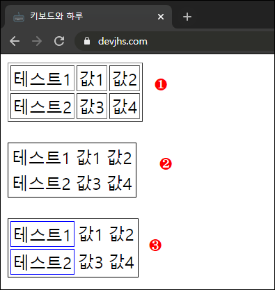 | 1 2 3 4 5 6 7 8 9 10 11 12 13 14 15 16 17 18 19 20 21 22 23 24 25 26 27 28 29 30 31 32 33 34 35 36 37 38 39 40 | < !DOCTYPE html> < html lang= "kr" > < head> < meta charset= "utf-8" > < title> 키보드와 하루 < /title> < /head> < body> 1 < tableborder = "1" > < tr> < td> 테스트1 < /td> < td> 값1 < /td> < td> 값2 < /td> < /tr> < tr> < td> 테스트2 < /td> < td> 값3 < /td> < td> 값4 < /td> < /tr> < /table> 2 < tablestyle =' margin-top : 20px ; border : 1px solid #000 ' > < tr> < td> 테스트1 < /td> < td> 값1 < /td> < td> 값2 < /td> < /tr> < tr> < td> 테스트2 < /td> < td> 값3 < /td> < td> 값4 < /td> < /tr> < /table> 3 < tablestyle =' margin-top : 20px ; border : 1px solid #000 ' > < tr> < tdstyle =' border : 1px solid #000 ' > 테스트1 < /td> < td> 값1 < /td> < td> 값2 < /td> < /tr> < tr> < tdstyle =' border : 1px solid #000 ' > 테스트2 < /td> < td> 값3 < /td> < td> 값4 < /td> < /tr> < /table> < /body> < /html> |