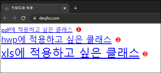 | 1 2 3 4 5 6 7 8 9 10 11 12 13 14 15 16 17 18 19 20 21 22 23 24 25 26 27 28 29 30 31 | < !DOCTYPE html> < html lang= "kr" > < head> < meta charset= "utf-8" > < title> 키보드와 하루 < /title> < style> 1 [class $="pdf"] { font-size : 20px ; } 2 [class $="hwp"] { font-size : 30px ; } 3 [class $="xls"] { font-size : 40px ; } < /style> < /head> < body> < div> < a href= "#" class = "test-pdf" > pdf에 적용하고 싶은 클래스 < /a> < a href= "#" class = "test-hwp" > hwp에 적용하고 싶은 클래스 < /a> < a href= "#" class = "test-xls" > xls에 적용하고 싶은 클래스 < /a> < /div> < /body> < /html> |