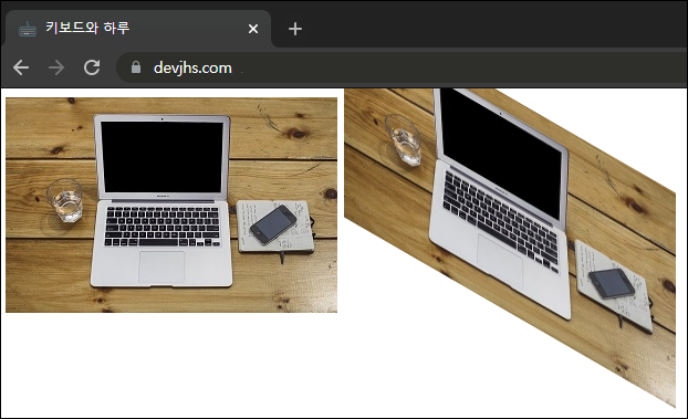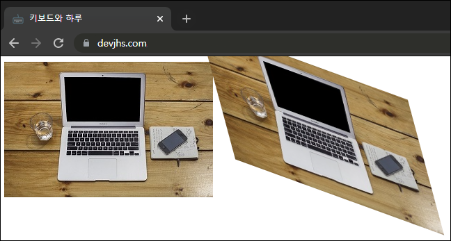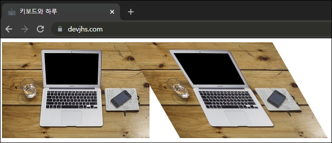 | 1 2 3 4 5 6 7 8 9 10 11 12 13 14 15 16 17 18 19 20 21 22 | < !DOCTYPE html> < html lang= "kr" > < head> < meta charset= "utf-8" > < title> 키보드와 하루 < /title> < /head> < body> < div> < img src= "home.jpg" >< /div> 1 < div style=' transform : skewX(30deg) ' > < img src= "home.jpg" > < /div> 2 < div style=' transform : skewY(30deg) ' > < img src= "home.jpg" > < /div> 3 < div style=' transform : skew(15deg,20deg) ' > < img src= "home.jpg" > < /div> < /body> < /html> |