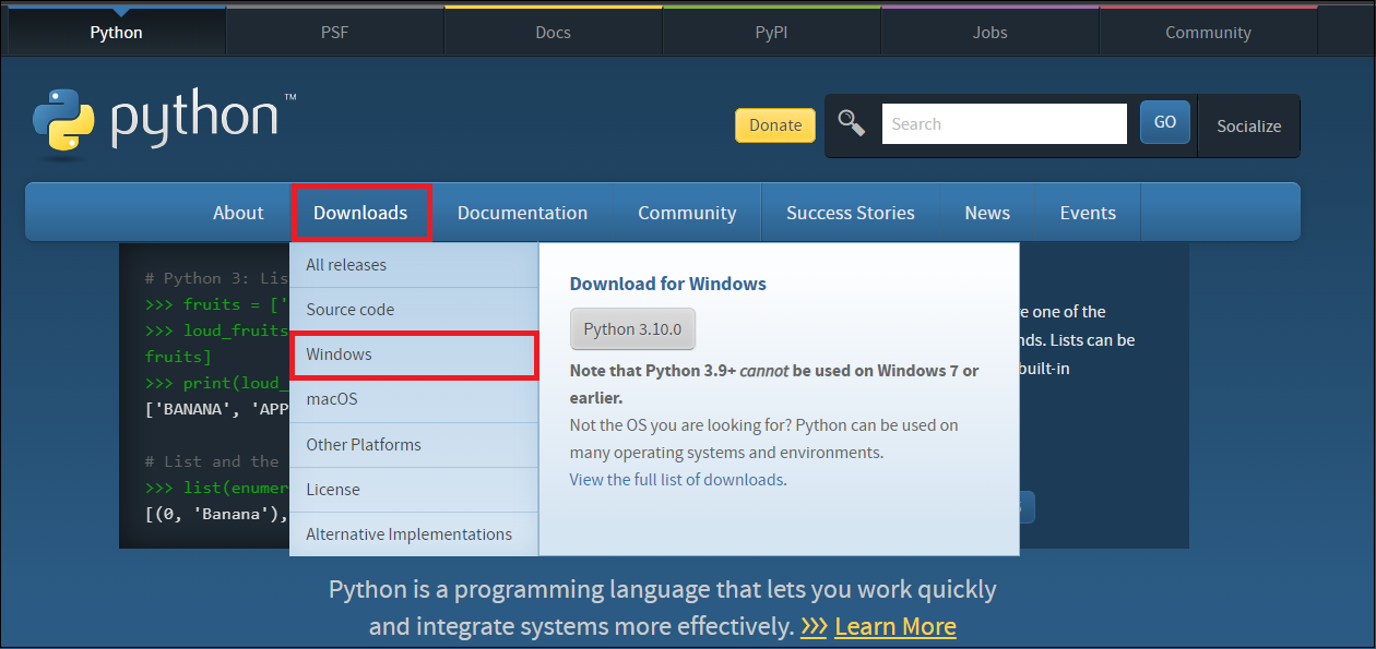네이버나 구글과 같은 검색 사이트에서 파이썬이나 python 이라고 검색을 하면 제일 위에 파이썬 공식 홈페이지 정보가 보입니다.